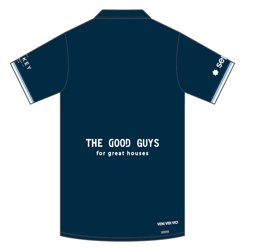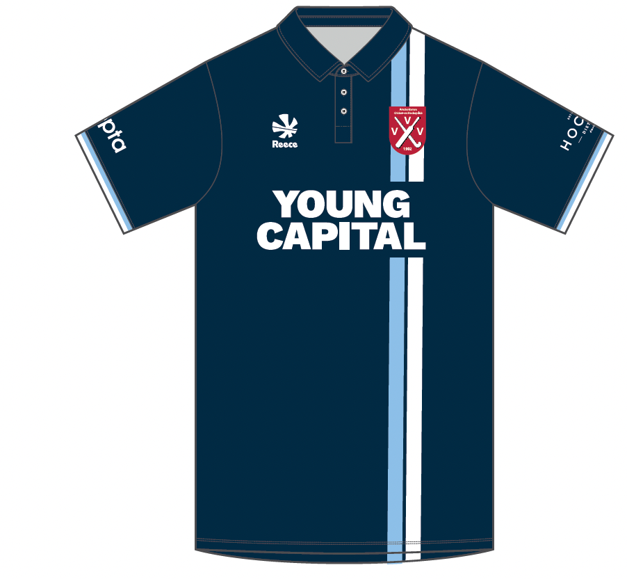 Het jongens uittenue van hockeyclub VVV is een donkerblauwe poloshirt met verticale witte en lichtblauwe baan op de linkerzijde en het clublogo op het hart.
